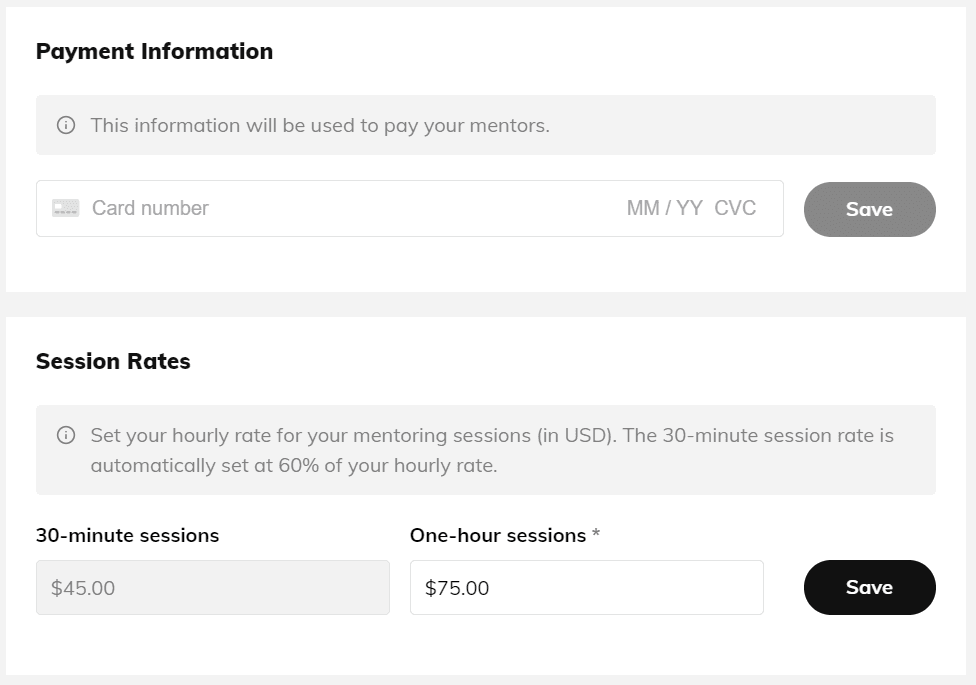As a mentor, you are able to book with other mentors too. This is where you can update your payment information to ensure payment to the mentors you book with.