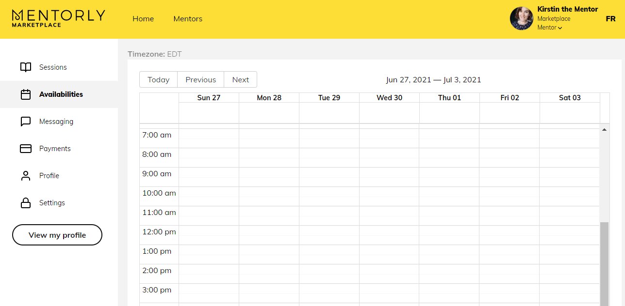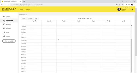 From your personal dashboard, click the Availability tab on the left-hand side. This will bring you to your Mentorly calendar.