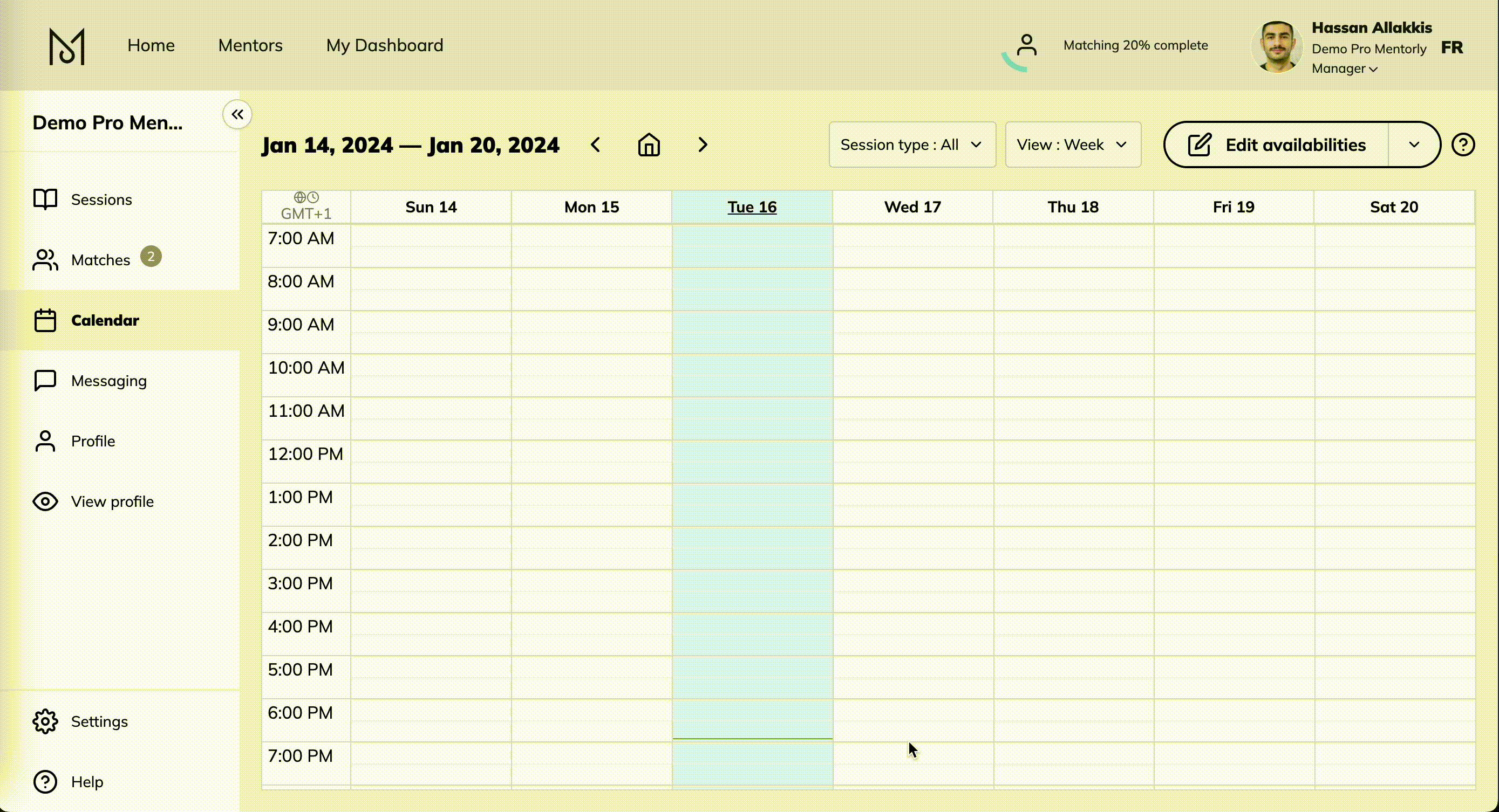 From your personal dashboard, click the Calendar tab on the left-hand side. This will bring you to your Mentorly calendar.