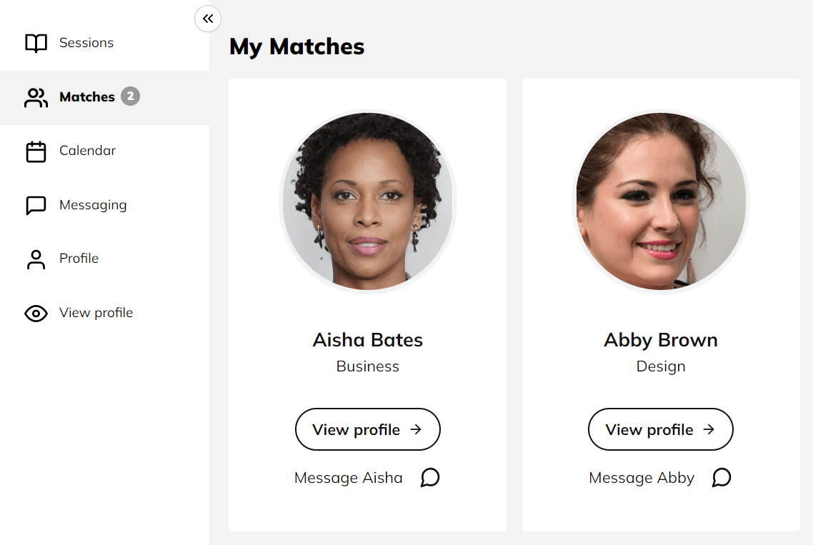 When you activate a match on Mentorly, it also gives both direct access to one another's profiles, where they can start messaging right away and book sessions together!