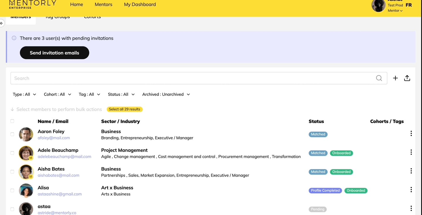 4. OR from the Members tab, you're able to sort and combine filters by each mentor/mentee, cohorts, tags, status, and more - talk about a time saver!
